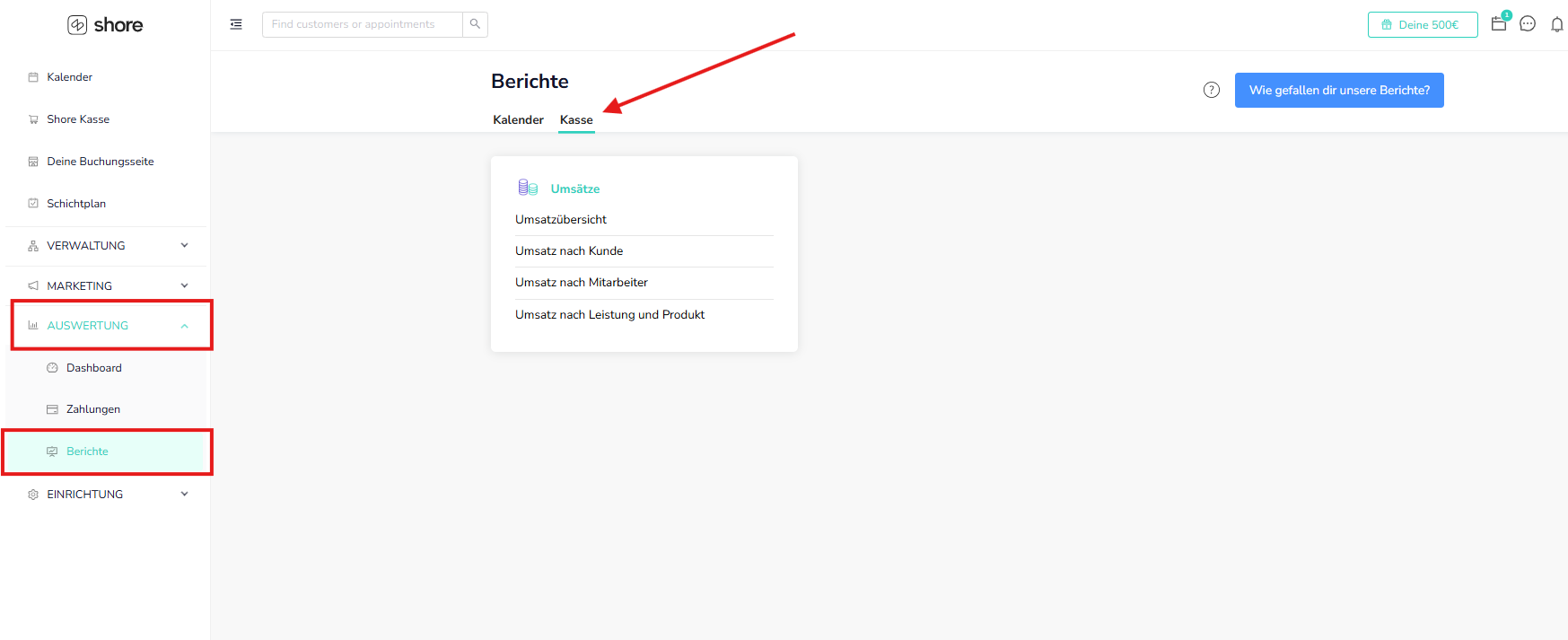 Öffne deinen Shore Kalender und das Hauptmenü oben links und klicke auf Auswertungen, dann auf Berichte.