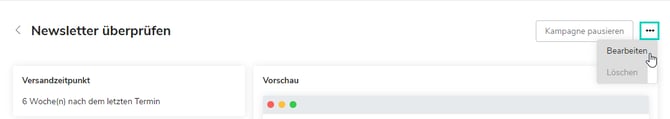 - Klicke die Kampagne an, um den Inhalt zu bearbeiten. Klicke dazu anschließend in der Ansicht “Newsletter überprüfen” auf die drei Punkte oben rechts und wähle Bearbeiten.