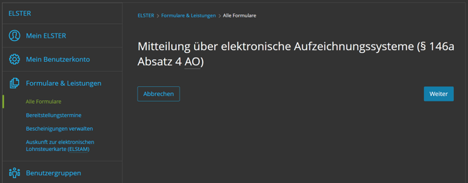 - Wähle das Formular "Mitteilung über elektronische Aufzeichnungssysteme (§ 146a Absatz 4 AO)" aus.