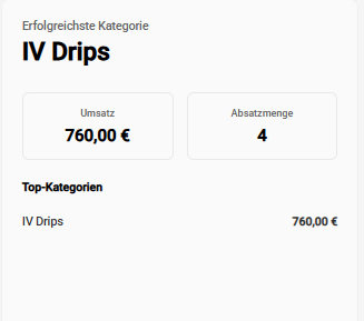 Um den Erfolg deiner Artikelgruppen besser einschätzen zu können, zeigt eine zusätzliche Kachel den Umsatz pro Kategorie an. Hier wird die Erfolgreichste Kategorie prominent hervorgehoben, zusammen mit der Anzahl der verkauften Artikel (Absatzmenge) und dem generierten Umsatz. Darunter sind die nächsten 5 besten Kategorien aufgeführt.