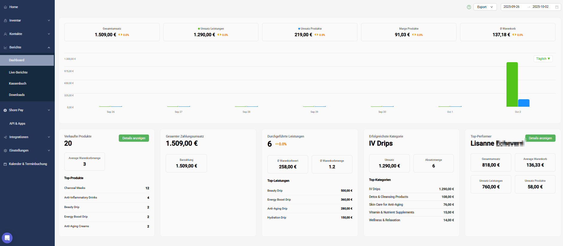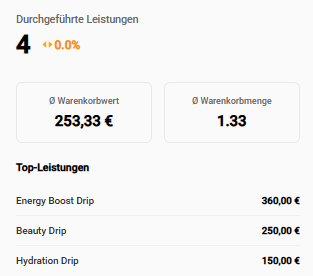 In dieser Kachel werden die Top-Leistungen ausgewertet, ähnlich wie bei den Produkten. Neben der Top 5 wird der durchschnittliche Warenkorb-Wert angezeigt, sowie die Anzahl der Leistungen pro Warenkorb im Durchschnitt. Wenn du auf die Kachel klickst, öffnet sich ein Fenster mit einer vollständigen Liste der verkauften Dienstleistungen. Du kannst die Reihenfolge über das Pfeil-Icon ganz einfach ändern.