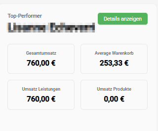 In der aktuellen Version präsentiert die Kachel den Mitarbeiter, der in allen Werten am besten abgeschnitten hat. Dieser Mitarbeiter wird durch verschiedene Karten begleitet, die detaillierte Einblicke in seine Verkaufsleistung bieten: