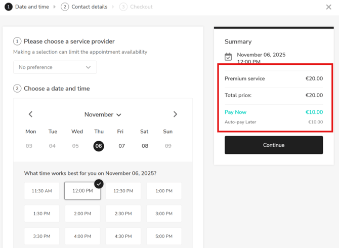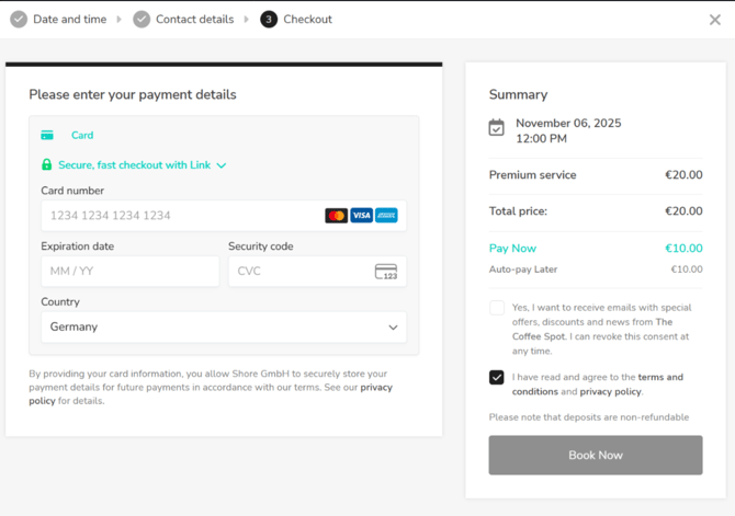 Der Restbetrag wird anschließend automatisch 1 Stunde vor dem Termin über die bei der Buchung gespeicherte Zahlungsmethode abgebucht.