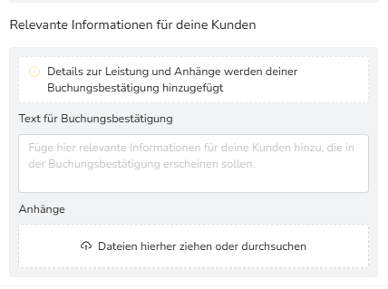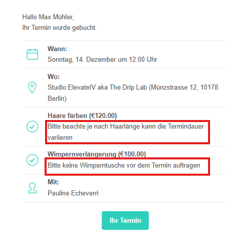 Diese Informationen werden automatisch zur Terminbestätigung hinzugefügt, sobald die Leistung gebucht wird.