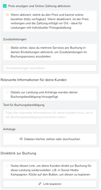 Zusätzlich zu den grundlegenden Angaben kannst du für jede Leistung weitere Funktionen aktivieren, um den Buchungsprozess optimal zu gestalten:
