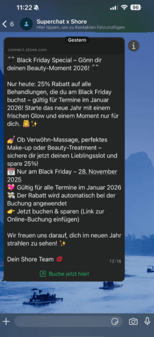 Ab sofort kannst du Kunden direkt über WhatsApp erreichen – für Erinnerungen, Aktionen oder Newsletter – und alles bequem in deinem Shore System verwalten.