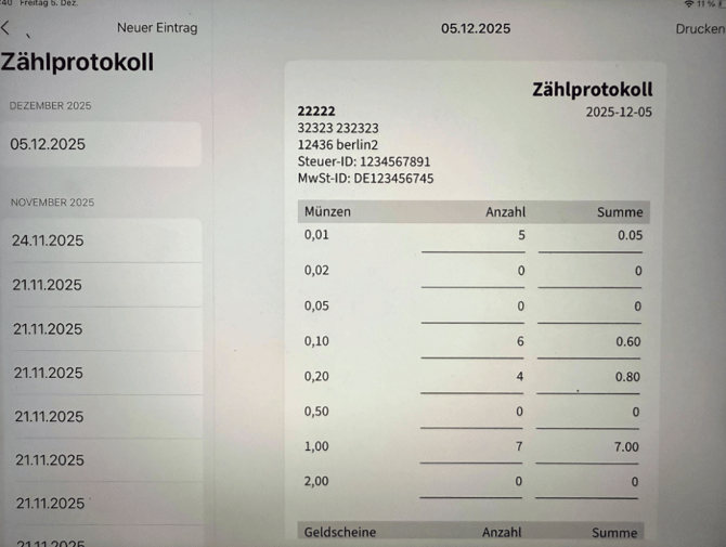 Das Zählprotokoll dient dazu, die Menge an Münzen und Scheinen in der Kasse zu erfassen und digital zu dokumentieren.