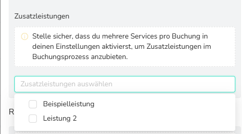 Damit Zusatzleistungen im Online-Buchungsprozess angezeigt werden, muss zuerst erlaubt sein, mehrere Leistungen pro Termin zu buchen.