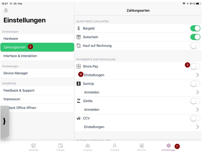 After successful setup, the "Shore Pay" payment method can now be used for all card payments in daily business transactions. Ensure that the toggle for Shore Pay is enabled in the payment methods section.