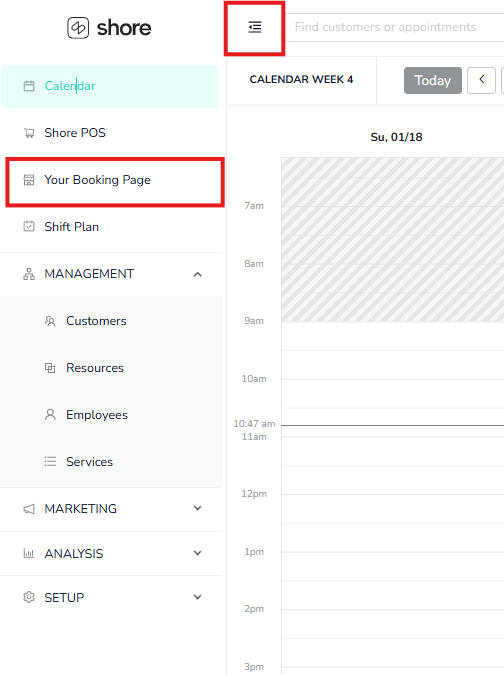 1. Click on the menu located at the top left corner and then Your Booking Page to access your booking page.