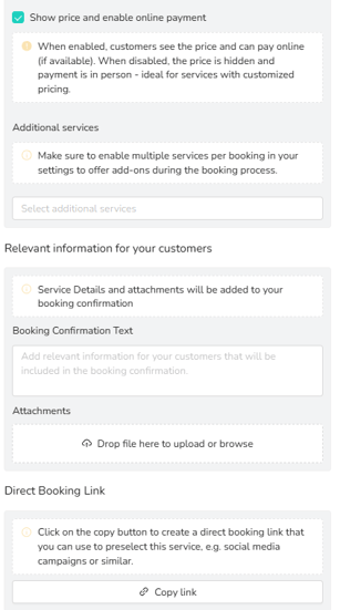Show during booking process: If you enter the check mark here, your customers can book the service online. Remove the check mark to create services which cannot be booked online, and must be arranged directly with you.