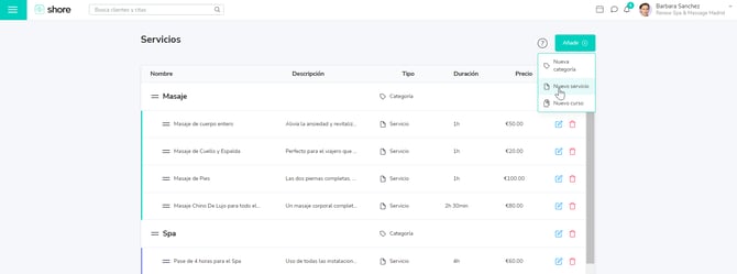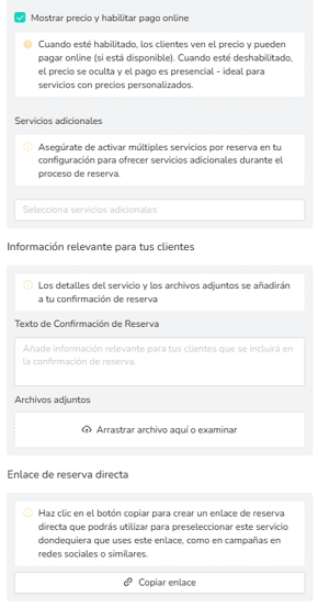 Además de la información básica, puedes activar funciones adicionales para cada servicio con el fin de optimizar el proceso de reserva: